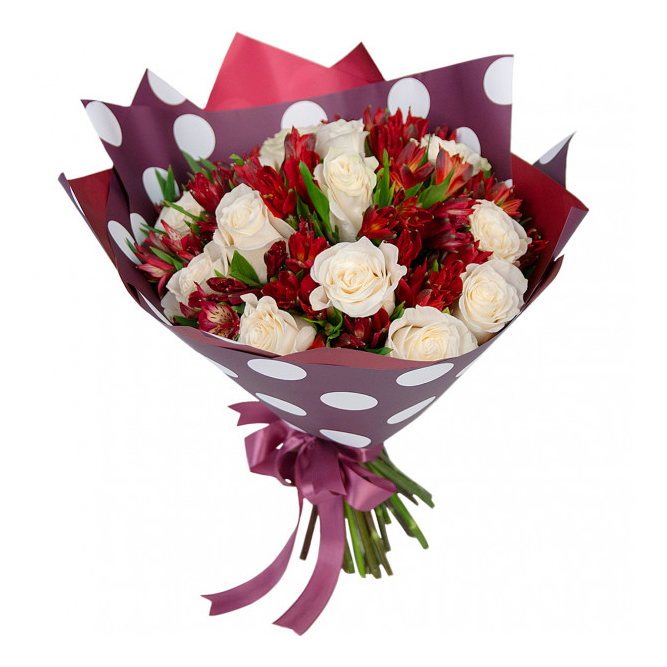 Контрастный букет сочетает нежные белые розы и яркие красные альстромерии. Идеальный подарок для выражения искренних чувств. Букет с доставкой на дом в Цивильске.
