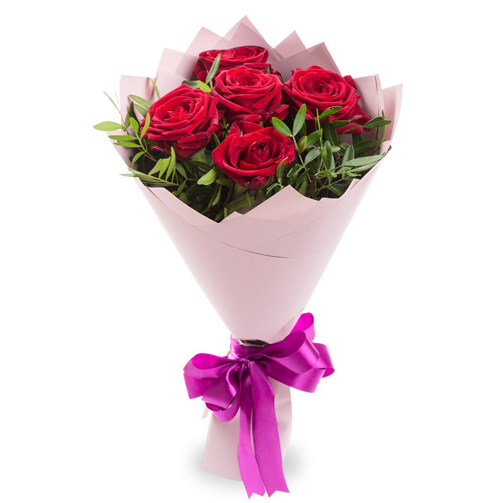 Изысканный букет из 5 красных роз с нежной фисташковой зеленью — идеальное сочетание страсти и свежести. Компактный, но выразительный подарок для особых моментов. Свежие цветы с доставкой в Цивильске.