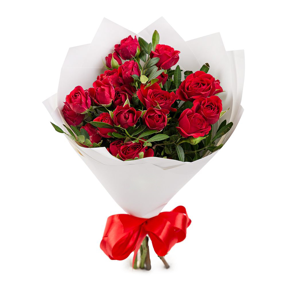 Утонченная композиция из 5 красных кустовых роз с фисташковой зеленью — воплощение страсти и свежести. Идеальный выбор для романтического подарка. Доставка роз Цивильск от Афло.