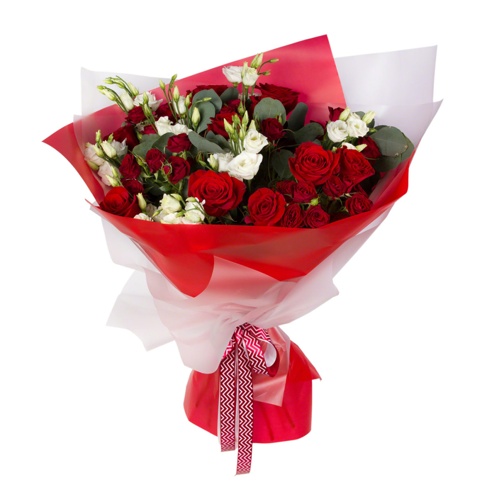 Контрастный букет «Рандеву» – красные розы и белые эустомы