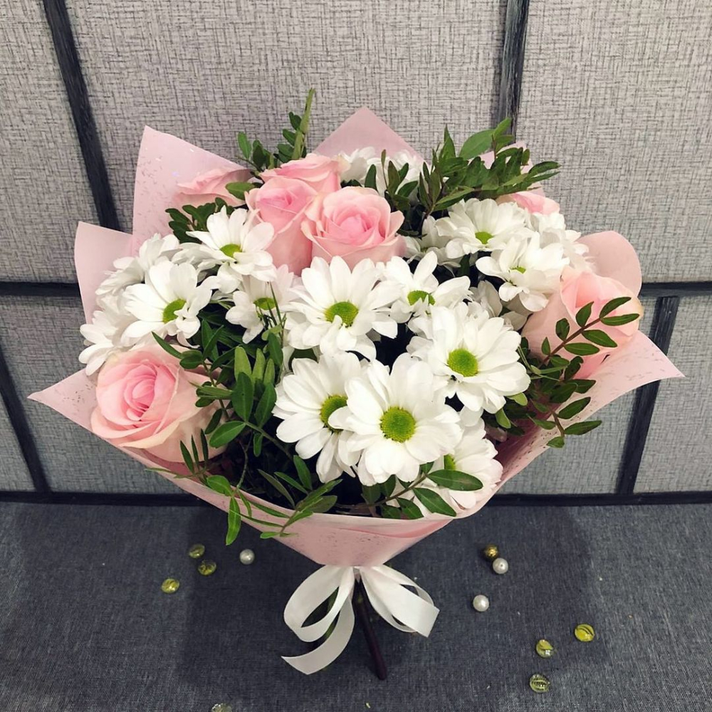 Букет из розовых роз и белых хризантем – элегантность в каждой детали