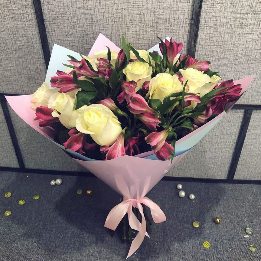 Нежный букет из белых роз и розовых альстромерий – гармония чистоты и нежности