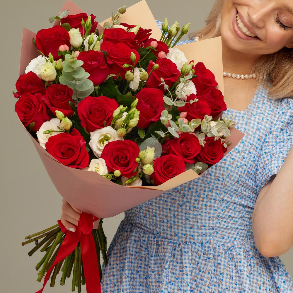 Изысканная композиция из 21 красной розы, 5 эустом и зелени — воплощение страсти и нежности. Идеальный выбор для признания в любви. Букет цветов с доставкой Цивильск.