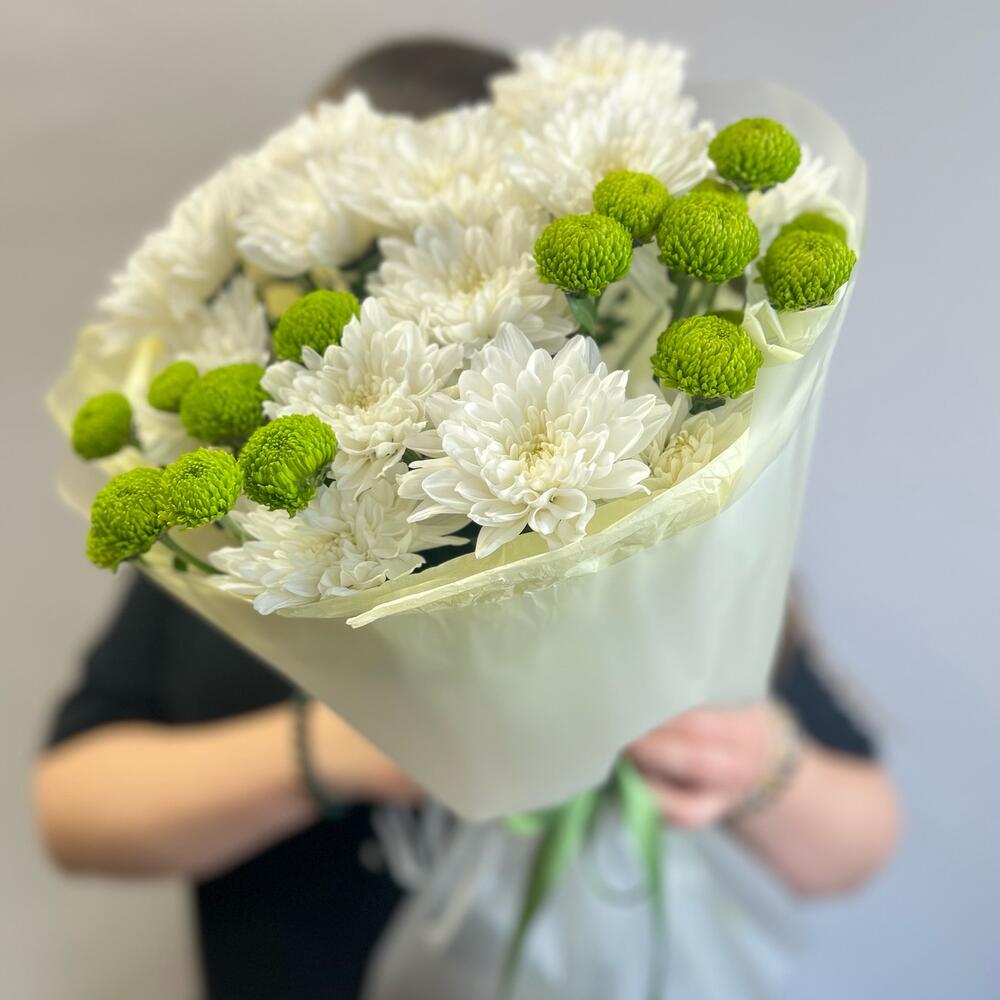 Уникальная композиция из белоснежных кустовых хризантем и редких зеленых «Филин Грин» — воплощение свежести и элегантности. Идеальный выбор для ценителей необычных цветочных решений. Букет цветов с доставкой Цивильск.