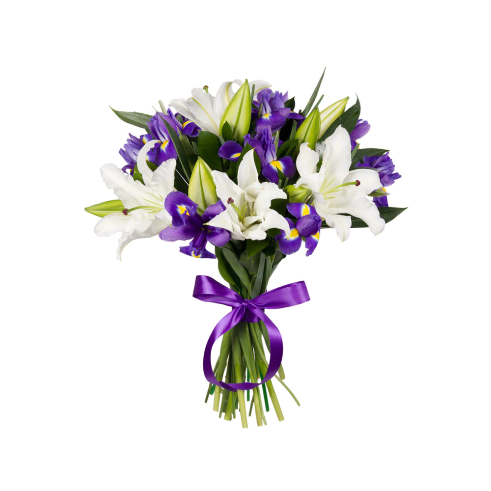 Букет Малый из белых лилий и голубых ирисов – гармония нежности и легкости